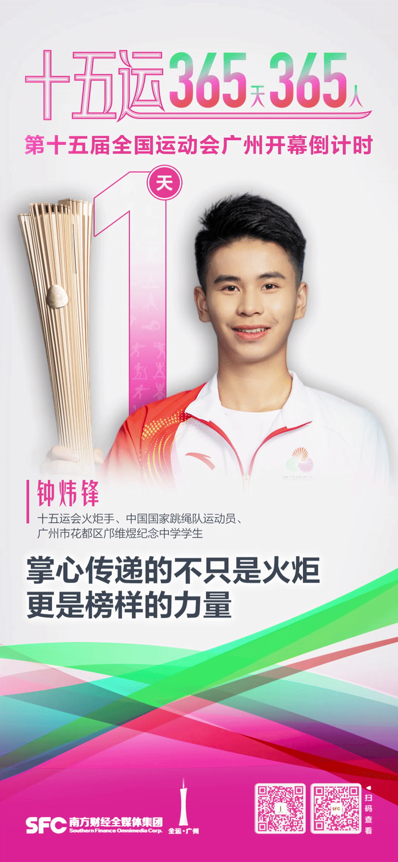 11月9日,第十五届全国运动会将在广州开幕。距离盛会开幕仅剩1天,全运的激情已在羊城点燃。在11月2日的火炬传递中,中国国家跳绳队运动员、广州市花都区邝维煜纪念中学学生钟炜锋,以广州站最年轻火炬手的身份接过第23棒,在万众瞩目下完成了属于少年的光荣奔跑,为盛会带来青春能量。