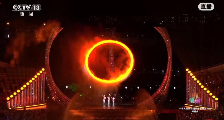 11月9日晚21时21分,十五运会主火炬在粤港澳三地运动员苏炳添、张家朗、李祎三人的共同点燃下,于广东奥体中心会场熊熊燃起。
