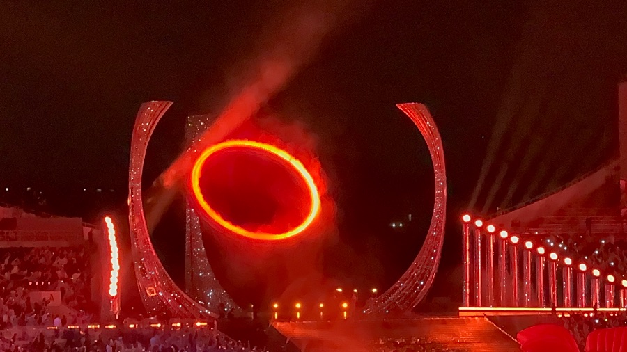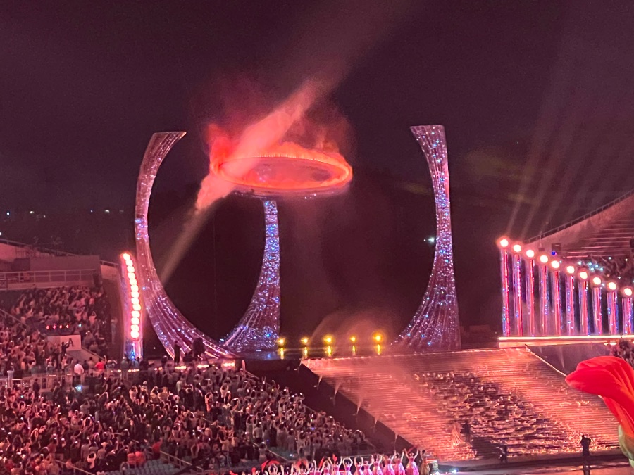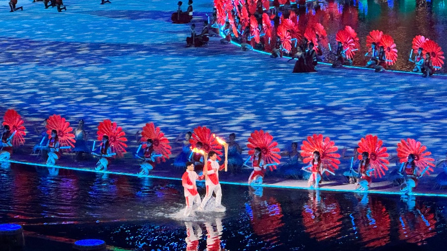 粤港澳三地运动员苏炳添、张家朗、李祎共同点燃十五运主火炬