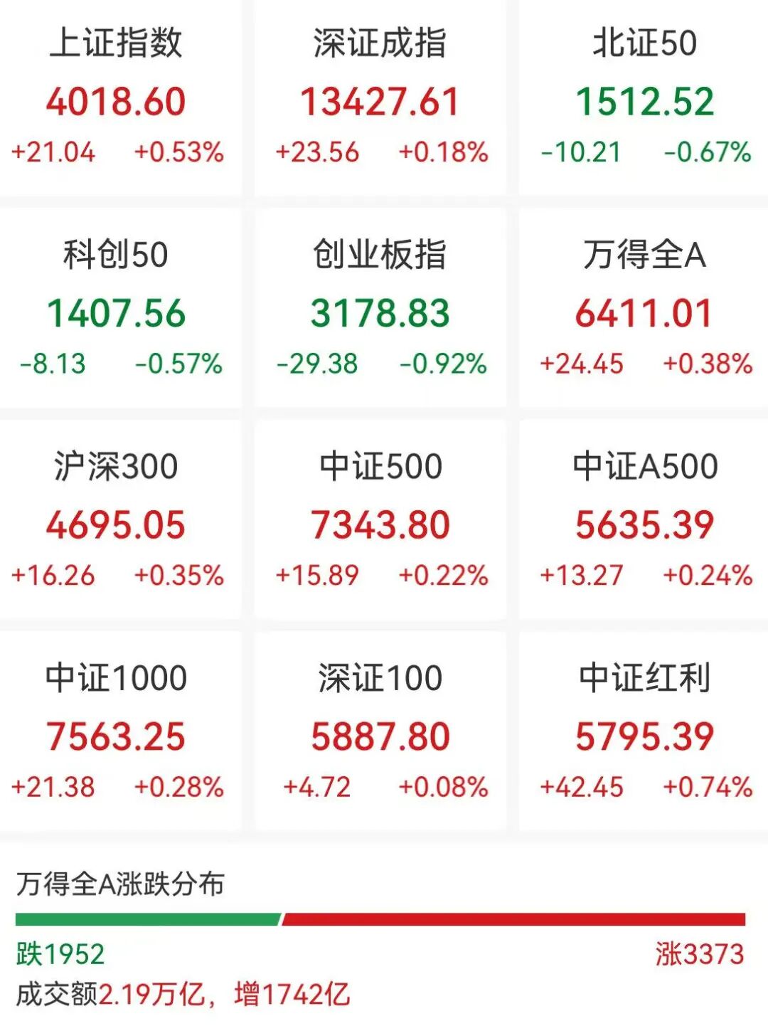 A股三大指数涨跌不一,沪指午后翻红后震荡拉升,创业板指跌幅收窄,截至收盘,沪指涨0.53%,深成指涨0.18%,创业板指跌0.92%。全市场成交额2.19万亿,超3300只个股上涨。板块方面,白酒、旅游及酒店、免税店等板块涨幅居前,燃气、风电设备、机器人等板块跌幅居前。