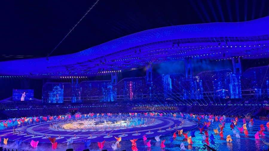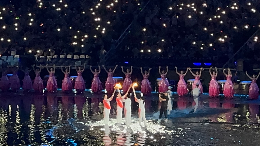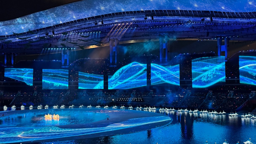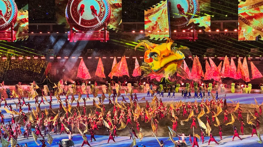 第三篇章《同梦同圆》,以“百花绽放”为视觉核心,寓意体育繁荣与湾区共进。交响乐、“岭南春早”与动感节拍交融,展现体育之美。