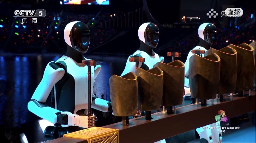 具体篇章层面,第一篇章《同根同源》由具身智能机器人敲响两千多年前的青铜句鑃,科技与古韵交织,开启千年商都的时空叙事。第二篇章《同心同缘》,以岭南非遗的现代化表达焕发文化新生。在《沧海一声笑》的经典旋律中,咏春与南拳方阵展现刚柔并济的武术之美;粤港澳三地粤剧名家以创新“粤歌”形式融合传统与现代;南狮腾跃、英歌铿锵、龙舟竞渡,共同绘就一幅充满文化自信的岭南画卷。