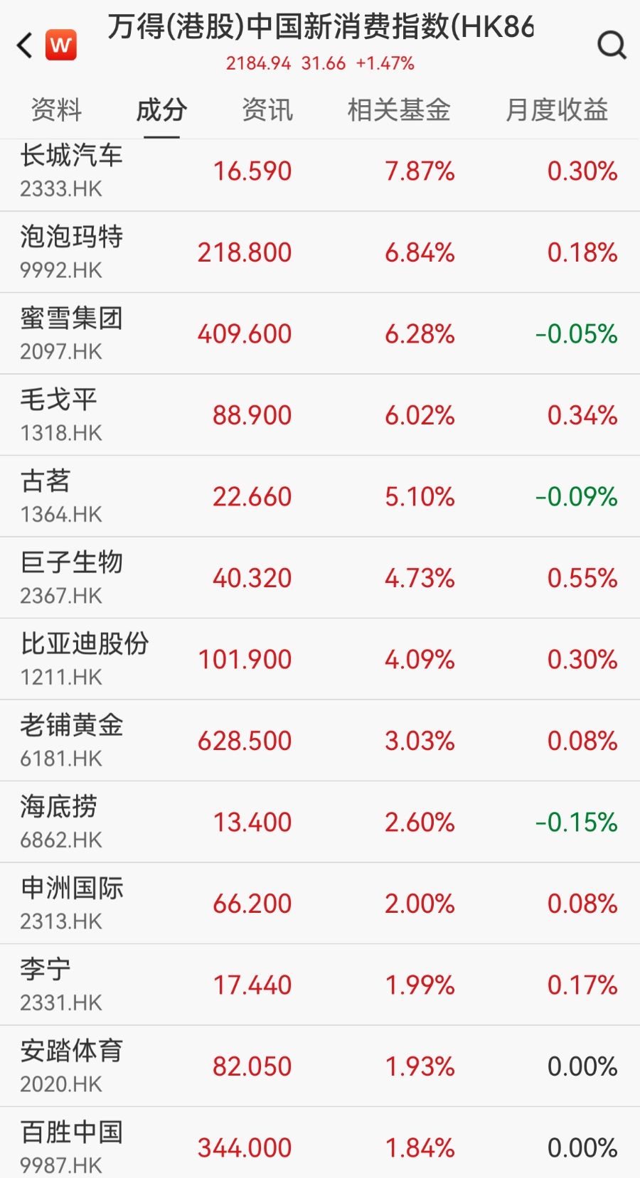 11月10日,港股新消费概念走强,截至午间收盘,沪上阿姨(02589.HK)涨超16%,泡泡玛特(09992.HK)、蜜雪集团(02097.HK)均涨超6%,卫龙美味(09985.HK)、奈雪的茶(02150.HK)、茶百道(02555.HK)、古茗(1364.HK)等个股跟涨。