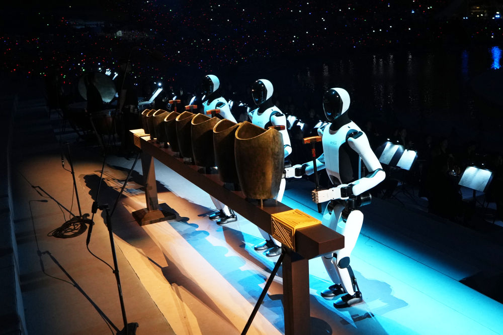 11月9日,开幕式上的工业人形机器人敲响千年前的中国古代乐器青铜句鑃。新华社记者 李一博 摄