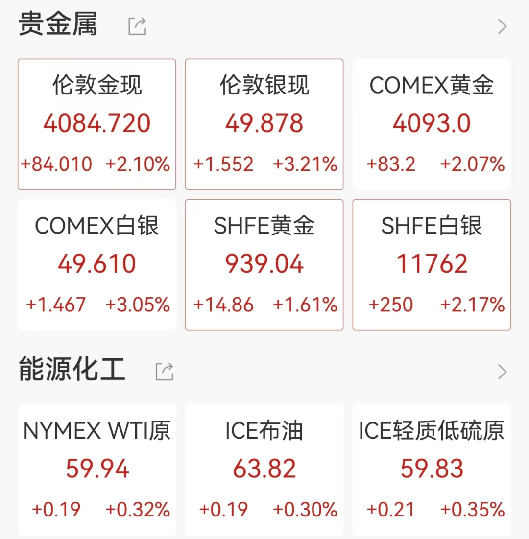 现货黄金、纽约期金均一度向上触及4100美元/盎司,为10月27日以来首次。截至22:47,现货黄金日内涨幅为2.1%,纽约期金涨2.07%。现货白银和COMEX白银均涨超3%。