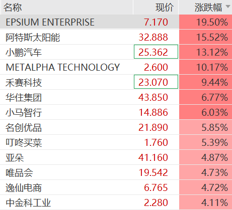 中概股同样走强,纳斯达克中国金龙指数涨超2.2%,阿特斯太阳能涨超15%,小鹏汽车涨超13%,小马智行涨6%,百度涨近4%,腾讯控股涨超2%。
