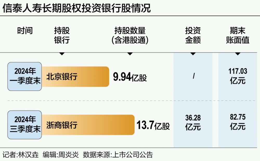 如,2023年一季度,信泰人寿保险股份有限公司(以下简称“信泰人寿”)进入北京银行(601169.SH)前十大股东名单后,一路增持。截至2024年一季度末,信泰人寿持有北京银行9.94亿股、占比4.7%。
