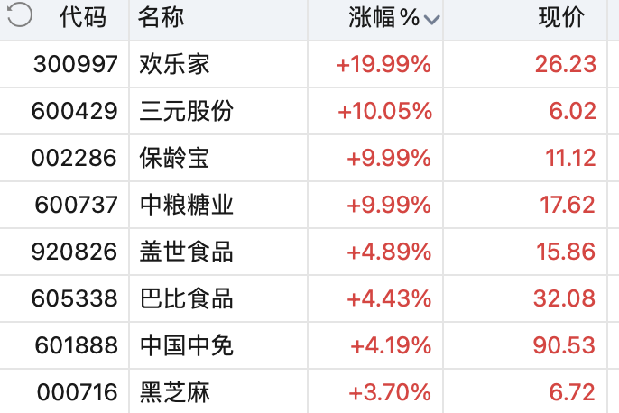 11月11日,A股市场呈现显著分化格局。午后大消费概念再度逆市活跃,欢乐家(300997.SZ)强势走出20CM两连板,三元股份(600429.SH)、保龄宝(002286.SZ)、中粮糖业(600737.SH)等多只消费股相继涨停,中国中免(601888.SH)、巴比食品(605338.SH)、黑芝麻(000716.SZ)、盖世食品(836826.BJ)等个股跟涨。