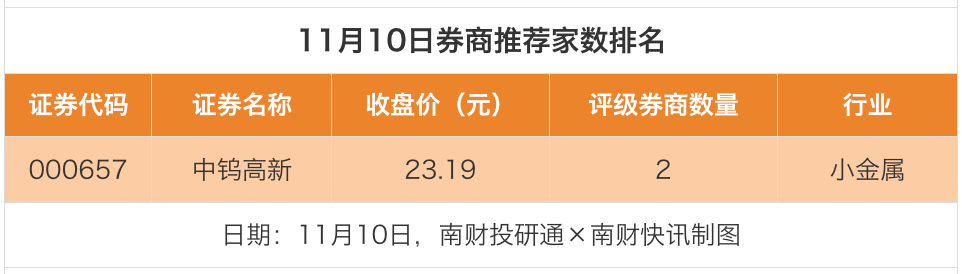 从券商推荐家数来看,11月10日有85家上市公司得到券商推荐,其中中钨高新获得2家推荐,中国能建、城建发展等均获得1家推荐。