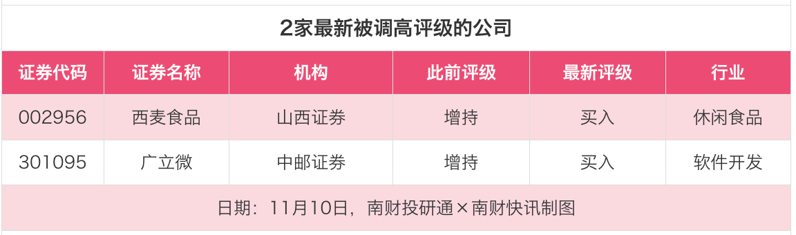 评级调高方面,11月10日,山西证券对西麦食品的评级、中邮证券对广立微的评级均从“增持”调高至“买入”。