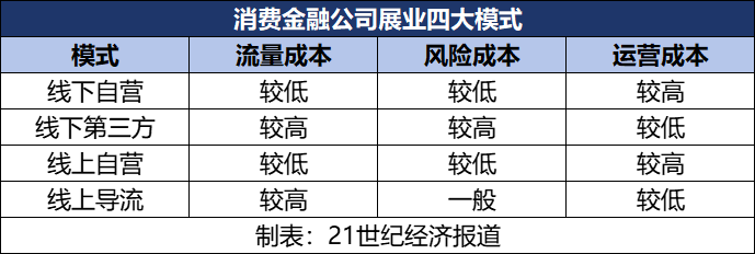 从获客渠道的划分来看,目前消金公司获客分为线上、线下渠道,自营、第三方引流渠道两类划分逻辑,分别形成了线下自营、线下第三方中介合作、线上自营、线上三方平台合作等四大类别,各模式对应的成本区别可通过下表简要划分。