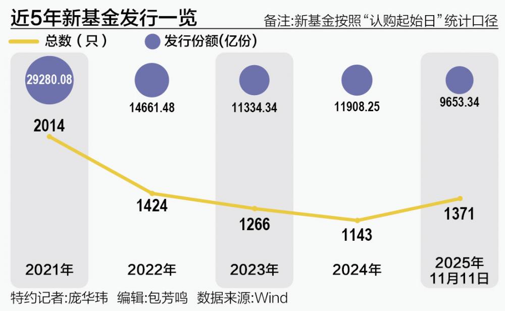 Wind数据显示,按照认购起始日统计口径(下同),截至11月11日,年内公募基金的新基发行数量达到1371只,超越2023年全年(1266只)和2024年全年(1143只),距离2022年全年发行数量(1424只)仅一步之遥。