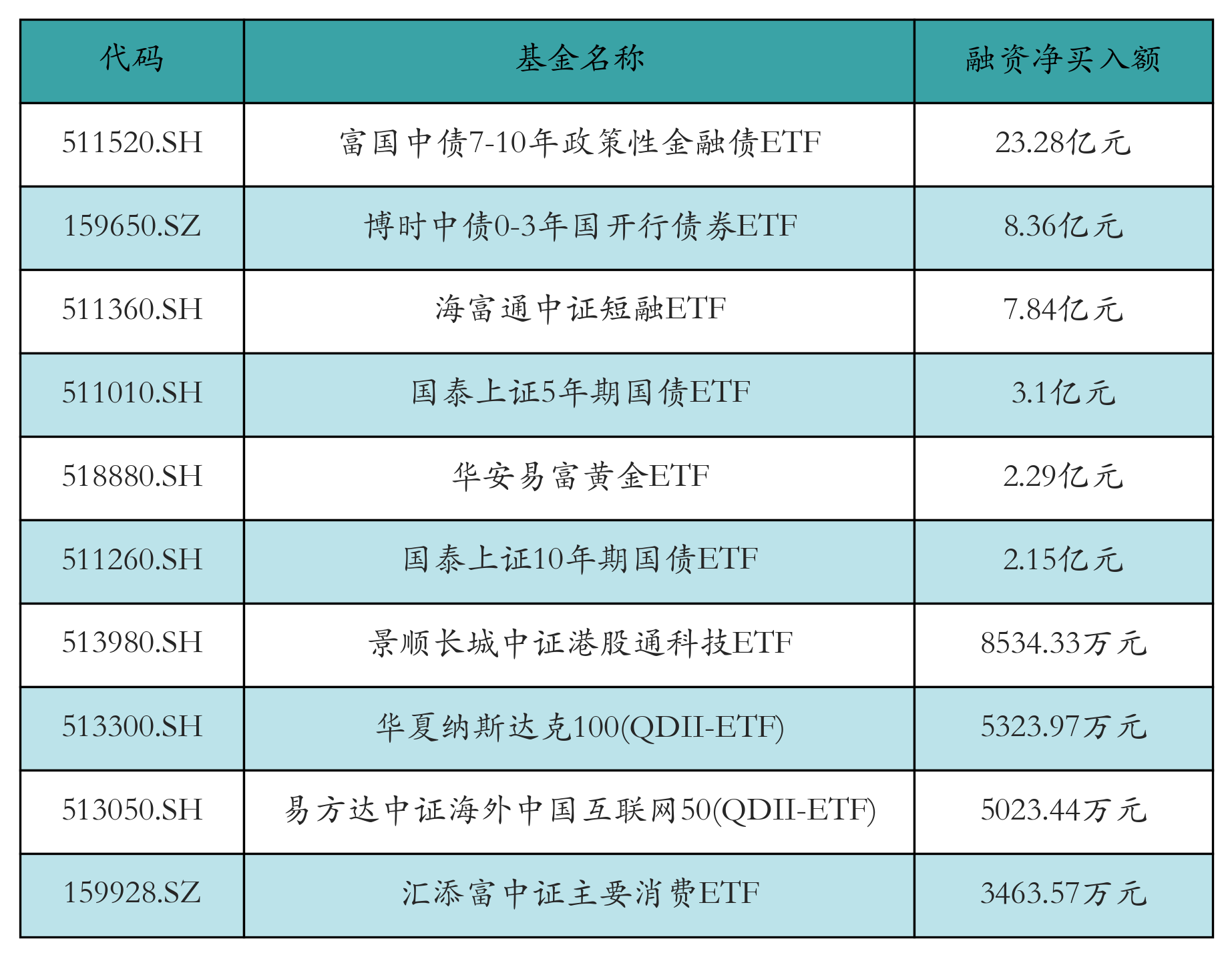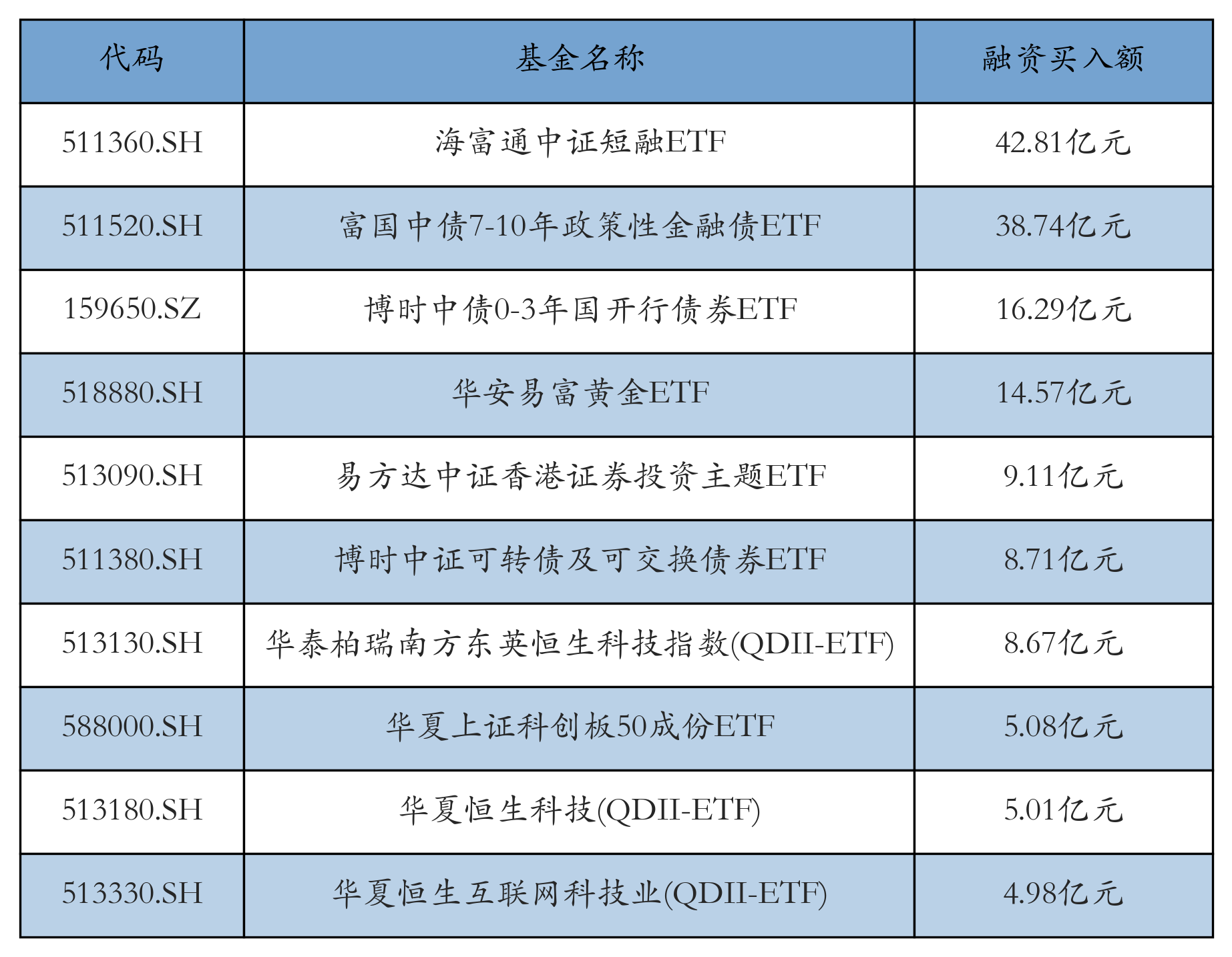 11月11日ETF融资买入额前三位分别为:海富通中证短融ETF(42.81亿元)、富国中债7-10年政策性金融债ETF(38.74亿元)和博时中债0-3年国开行债券ETF(16.29亿元),前10具体见下表: