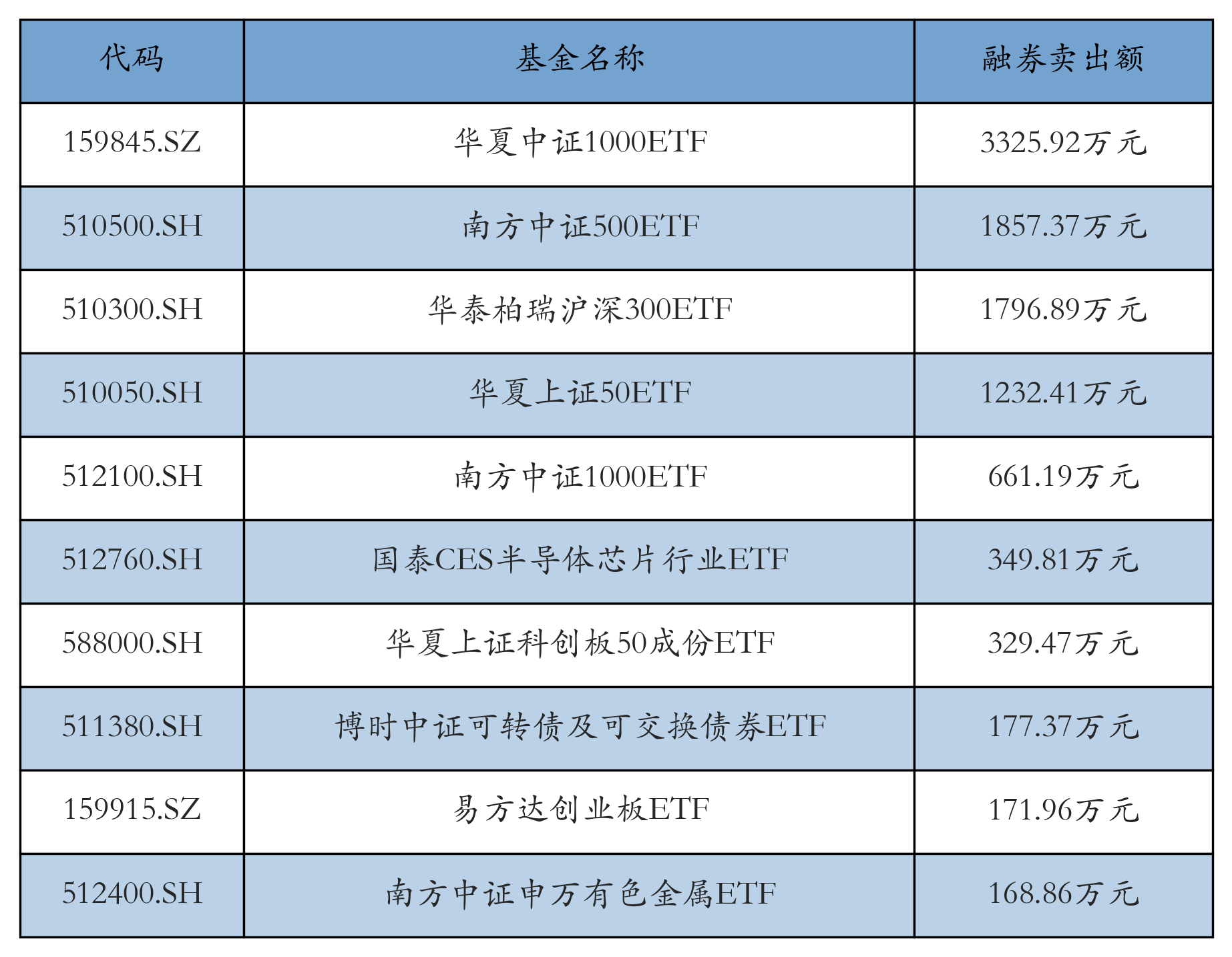 11月11日ETF融券卖出额前三位分别为:华夏中证1000ETF(3325.92万元)、南方中证500ETF(1857.37万元)和华泰柏瑞沪深300ETF(1796.89万元),前10具体见下表: