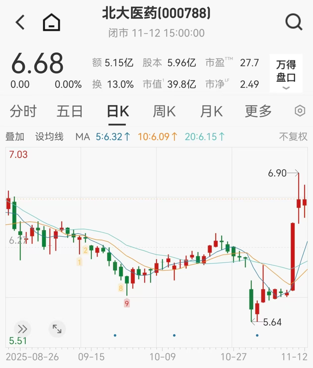 二级市场上,近期抗流感概念持续走强,北大医药股价连日上涨,截至11月12日,公司最新市值为39.8亿元。