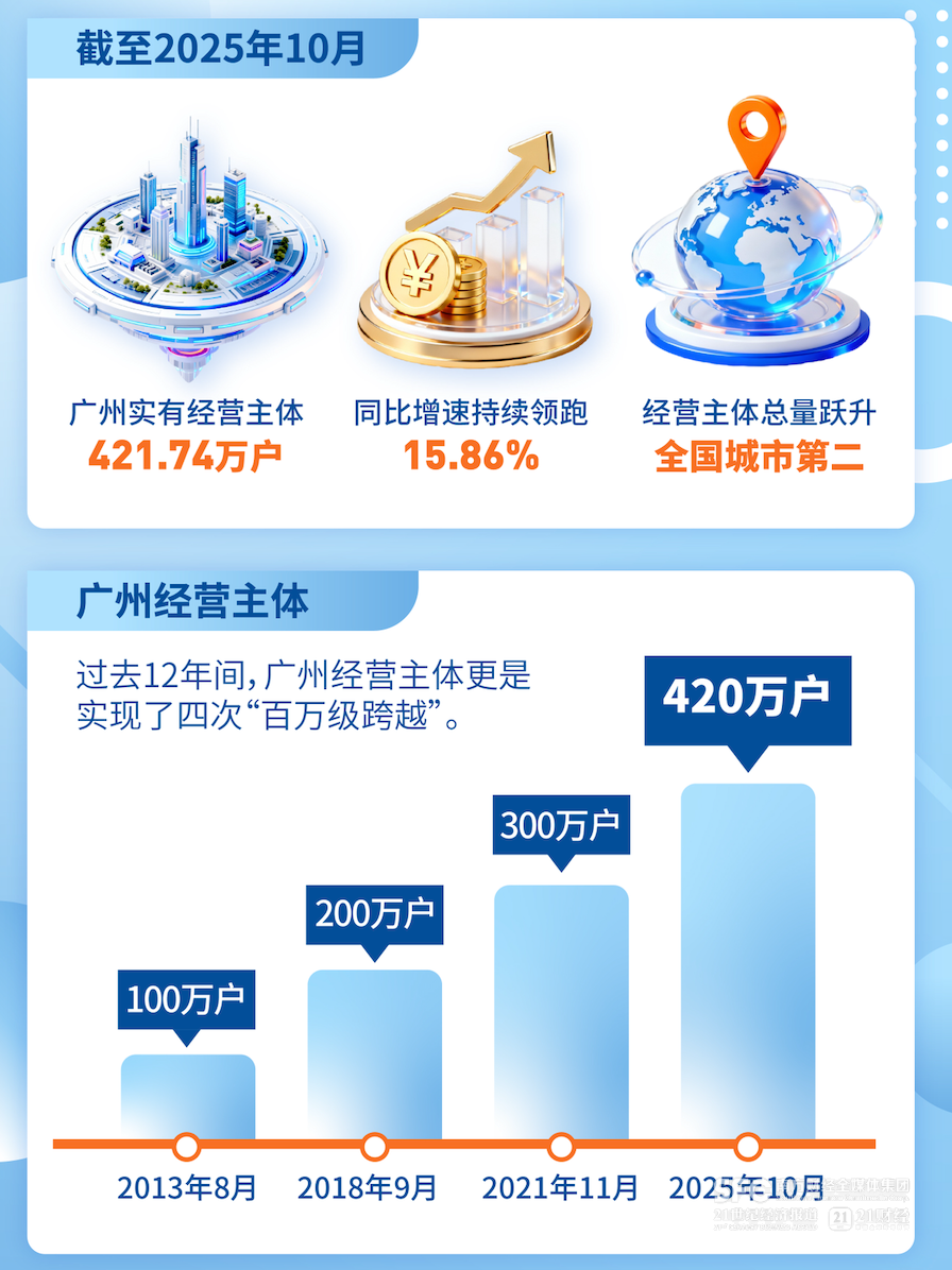 过去12年,广州的经营主体总量实现了四次百万级的跨越。2013年8月突破100万户,2018年9月达200万户,2021年11月增至300万户,直至目前突破420万户。