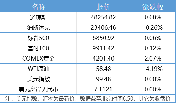 1、美国三大股指收盘涨跌不一,道指涨0.68%报48254.82点,续创收盘新高,标普500指数涨0.06%报6850.92点,纳指跌0.26%报23406.46点。高盛集团、联合健康集团涨超3%,领涨道指。万得美国科技七巨头指数跌0.8%,脸书跌近3%,特斯拉跌逾2%。中概股多数下跌,大全新能源跌近10%,腾讯音乐跌超8%。