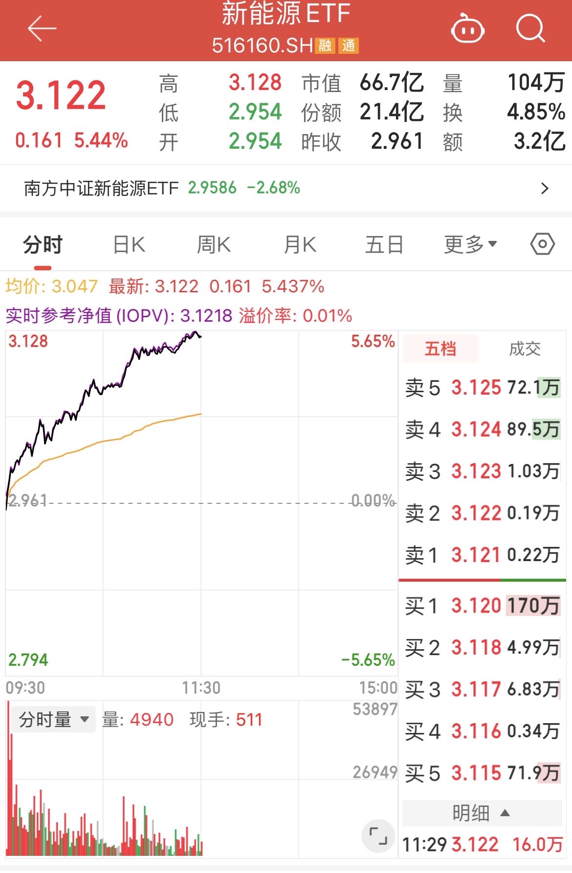 11月13日,新能源板块开盘即展现强势行情,锂电电解液、固态电池、储能等细分概念涨幅居前。截至午盘,跟踪中证新能源指数的新能源ETF(516160.SH)同步大涨5.44%,市场情绪显著升温。其重仓股中,宁德时代股价涨超8%,距离历史新高仅一步之遥;先导智能涨超7%,阳光电源、隆基绿能、特变电动亦同步跟涨。