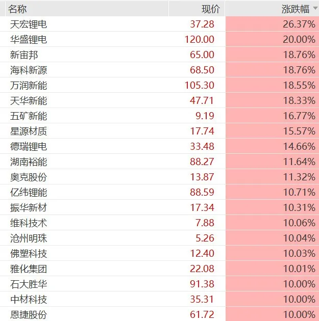 锂电池概念走强,天宏锂电涨超26%,中利集团、融捷股份、维科技术等多股涨停。消息面上,自10月14日至11月10日,碳酸锂期货价格持续上涨,区间涨幅已达20%。据证券时报e公司消息,近期磷酸铁锂行业生产积极性高涨,头部材料厂多处于满产甚至超产状态。业内人士称,目前这种供需两旺的态势有望延续至年末。