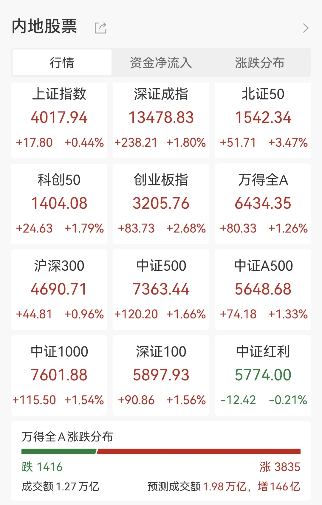 11月13日,A股市场早盘震荡走强,截至午盘,沪指涨0.44%,深成指涨1.8%,创业板指涨2.68%。沪深两市半日成交额1.27万亿,较上个交易日放量11亿。全市场超3800只个股上涨。