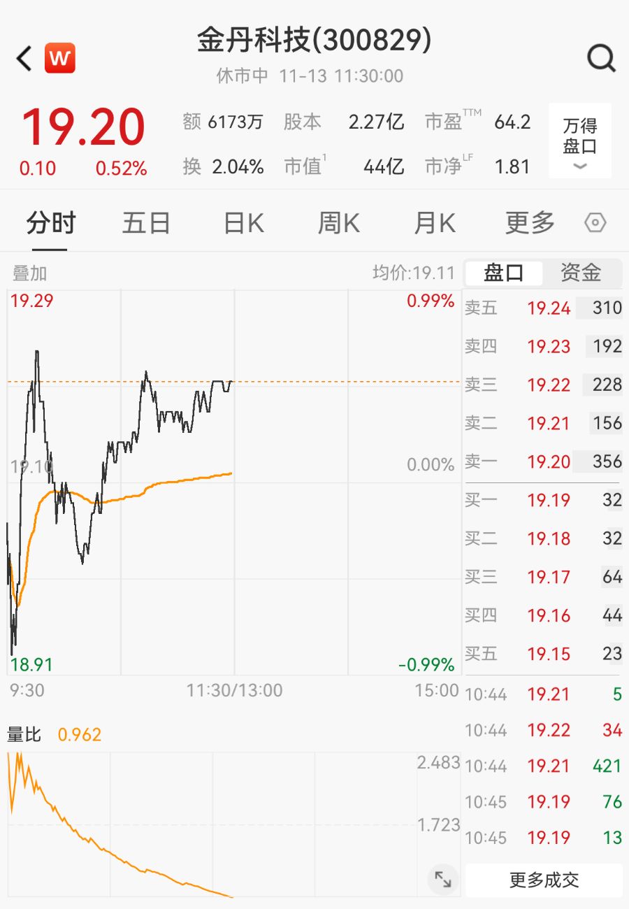 今日早盘,金丹科技股价震荡,截至午间收盘,报19.20元/股,总市值为44亿元。