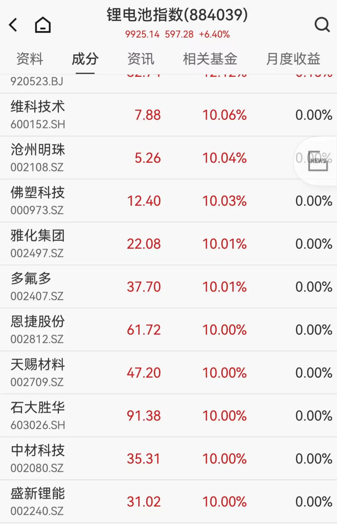 锂电池产业链全线大涨,大消费板块表现活跃,步步高等多股涨停,三元股份4连板。福建板块持续走高,厦工股份、中国武夷等十余股涨停。下跌方面,油气板块下挫,准油股份、中国海油走势较弱。