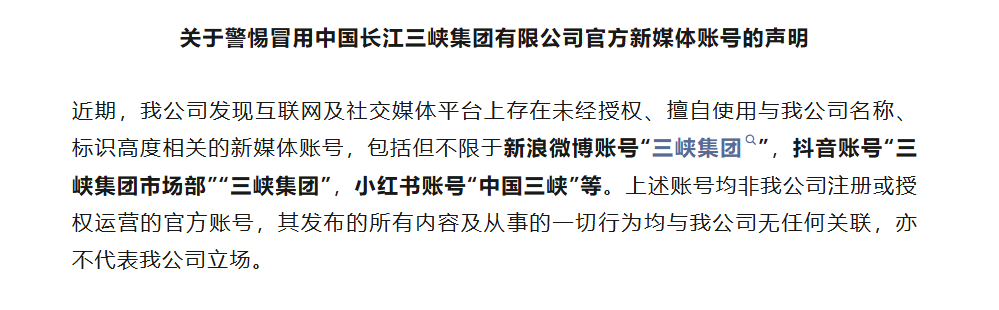 11月13日,三峡集团在“中国电力报”官方公众号上发布《关于警惕冒用中国长江三峡集团有限公司官方新媒体账号的声明》,称近期三峡集团发现互联网及社交媒体平台上存在未经授权、擅自使用与公司名称、标识高度相关的新媒体账号,包括但不限于新浪微博账号“三峡集团”,抖音账号“三峡集团市场部”“三峡集团”,小红书账号“中国三峡”等。