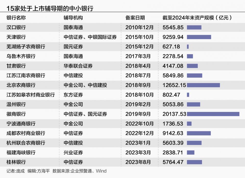 自2022年兰州银行上市后,A股银行板块已逾两年未见“新面孔”,中小银行上市进程明显放缓。尽管如此,银行上市“预备役”队伍依旧庞大,目前仍有15家银行处于上市辅导备案期。