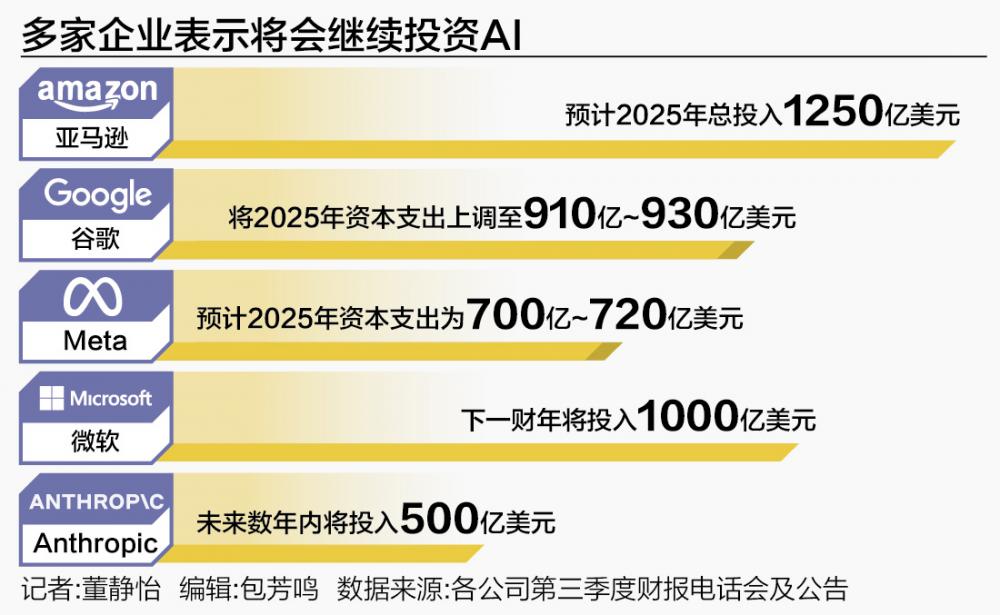 在第三季度财报电话会上,四家企业都表示将会继续投资AI。具体到数字上,亚马逊表示2025年预计总投入1250亿美元;谷歌将2025年资本支出上调至910亿至930亿美元;Meta预计2025年资本支出为700亿至720亿美元,几乎是去年的两倍;微软上季度投入创纪录的349亿美元,并宣布下一财年将投入1000亿美元。