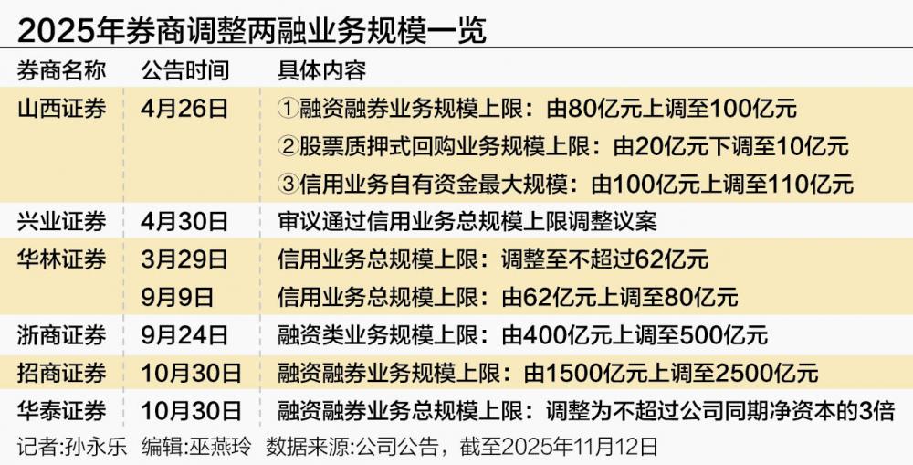 据记者不完全统计,截至目前,年内已有至少6家证券公司宣布上调两融及相关融资类业务规模上限,包括华林证券、山西证券、兴业证券、浙商证券。