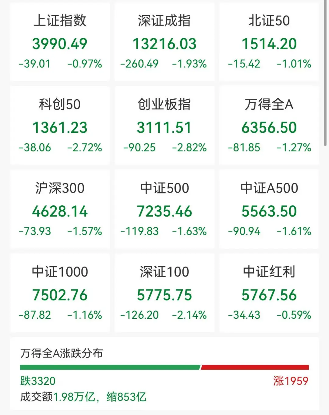 11月14日,A股市场全天震荡调整,截至收盘,沪指跌0.97%,失守4000点,深成指跌1.93%,创业板指跌2.82%。沪深两市成交额1.96万亿,较上一个交易日缩量853亿。
