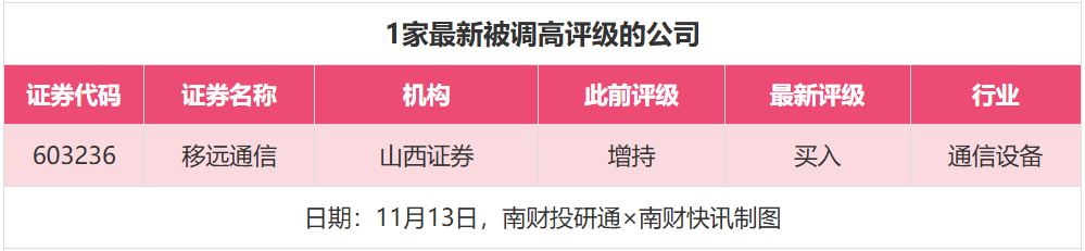 评级调高方面,11月13日,券商调高上市公司评级达到1家次,山西证券对移远通信的评级从“增持”调高至“买入”。