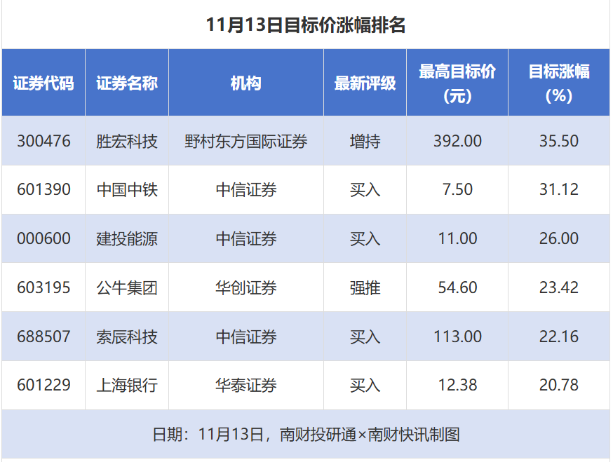 南财投研通数据显示,11月13日,券商给予上市公司目标价共6次,按最新收盘价计算,目标价涨幅排名居前的公司有胜宏科技、中国中铁、建投能源,目标价涨幅分别为35.50%、31.12%、26.00%,分别属于元件、基础建设、电力行业。