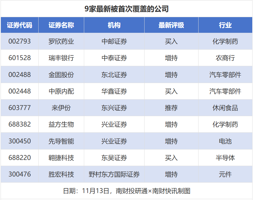首次覆盖方面,11月13日券商共给出了9次首次覆盖,其中罗欣药业获得中邮证券给予“买入”评级,瑞丰银行获得中泰证券给予“增持”评级,金固股份获得东北证券给予“增持”评级,中原内配获得华鑫证券给予“买入”评级,来伊份获得东兴证券给予“推荐”评级。