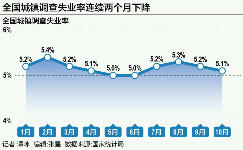 国家统计局数据显示,就业形势总体稳定,城镇调查失业率继续下降,10月份全国城镇调查失业率为5.1%,比上月下降0.1个百分点,连续两个月下降。