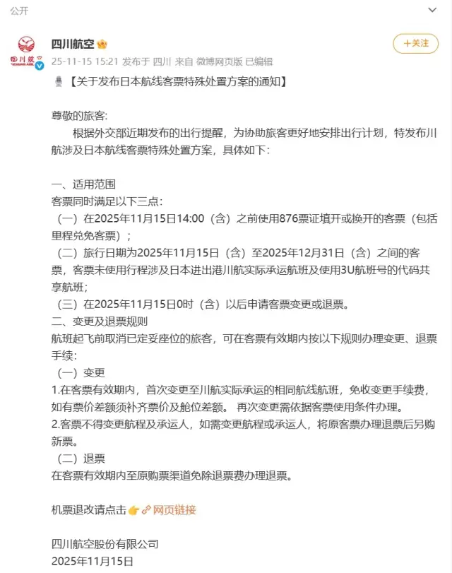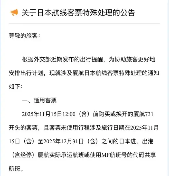 国航在通知中明确,对于在今年11月15日12时(含)前购买或换开产生新票号的国航999开头的客票(包括里程奖励客票);客票未使用行程涉及旅行日期为2025年11月15日(含)至2025年12月31日(含)之间东京、大阪、名古屋、福冈、仙台、广岛、札幌、冲绳进出港的国航实际承运航班和挂CA航班号的代码共享航班;在2025年11月15日0时(含)以后申请客票变更或退票(以取消客票订座时间为准)。在客票有效期内,首次变更免收变更手续费,但需收取子舱位差价及淡旺季差价,再次变更需依据客票使用条件办理。在客票有效期内,可以办理未使用航段退票,免收退票手续费。