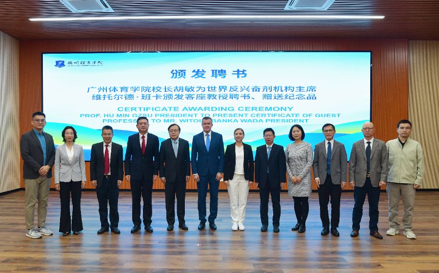 11月14日上午,广州体育学院迎来历史性一刻——世界反兴奋剂机构(WADA)主席维托尔德·班卡正式受聘为学校客座教授。这是班卡首次在中国高校担任客座教授,标志着中国体育高等教育与全球反兴奋剂治理体系的积极对接,也为广州体育学院搭建高水平国际合作平台提供了有力支撑。国家体育总局科教司司长陈志宇与广州体育学院党委书记米银俊、校长胡敏等共同出席见证。