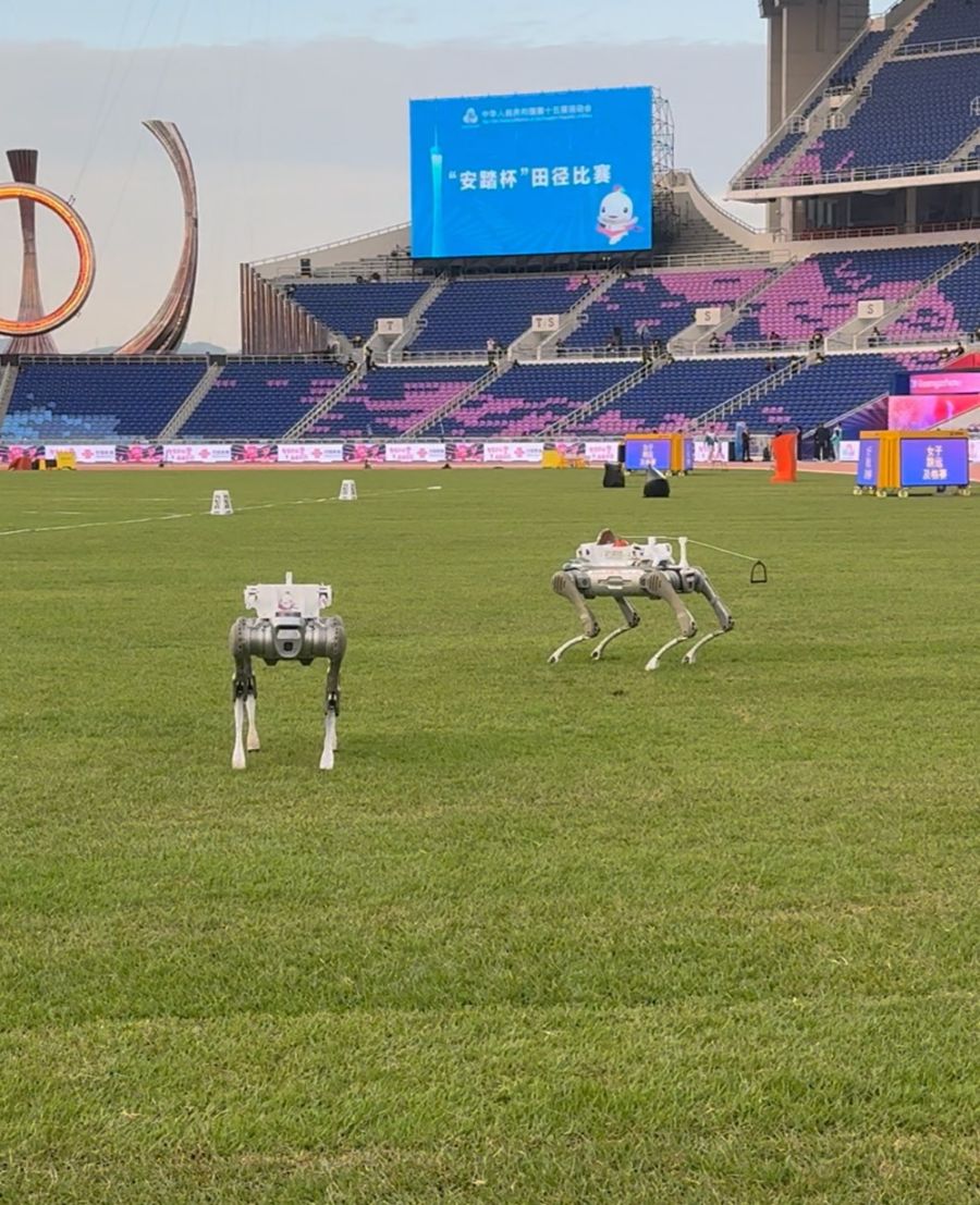 除人形机器人外,在赛场上,还有机器狗化身标枪转运员,背着标枪快步奔跑。据广州动感机器人科技有限公司、广东修炼科技股份有限公司技术总监李志鹏介绍,这款机器狗最快可以跑到6米/秒,在女子标枪赛上,两只机器狗分工合作,一只去拾取标枪,另一只待命,减少了人力成本。