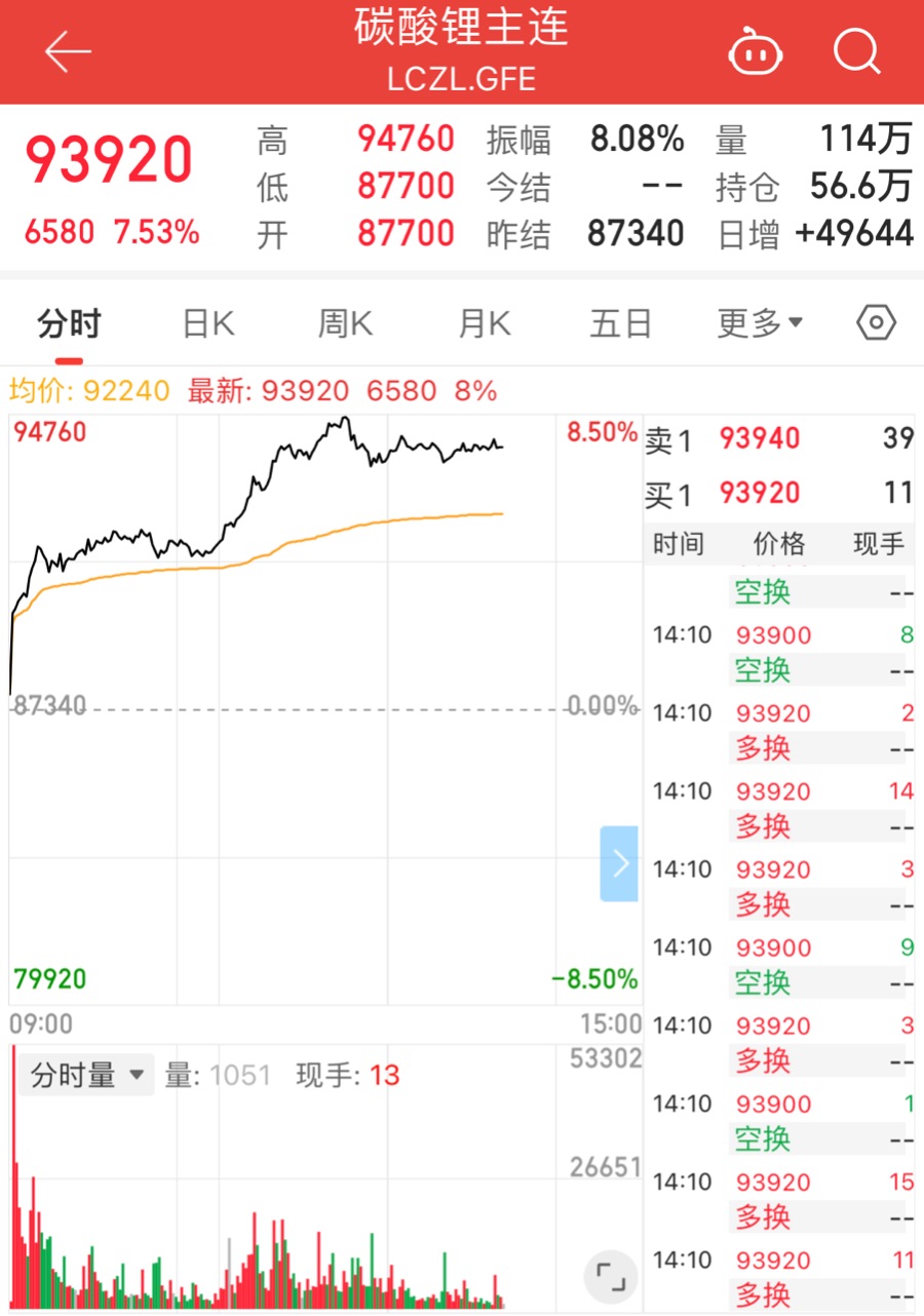 11月17日,碳酸锂期货全线涨超7%,其中主力合约盘中突破9.4万关口,最高触及94760元/吨,刷新一年余新高。自今年6月以来,碳酸锂连续主力合约区间涨幅已超56%。