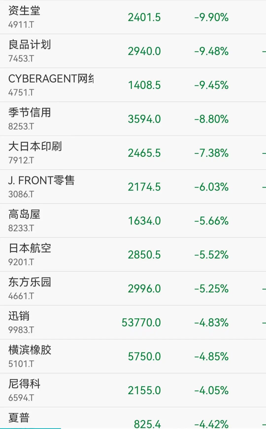 日本旅游类股大幅下挫,资生堂股价跌近10%。日本航空跌超5%。日本其他消费品/零售股方面,三丽鸥跌7.8%、亚瑟士跌6.6%、迅销跌4.83%。百货店经营商伊势丹三越控股公司股价一度下跌12%。良品计划股价一度下跌12%,创2024年8月以来最大跌幅。