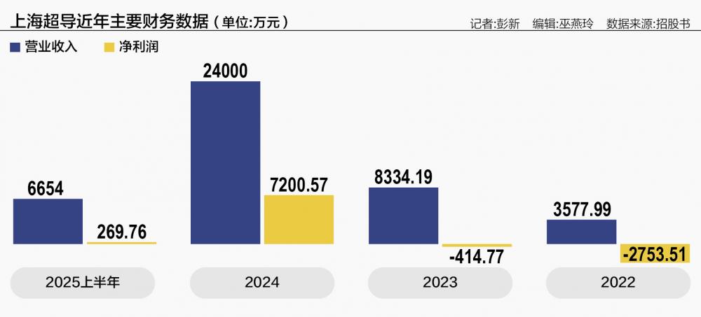 招股书显示,2022年、2023年、2024年及2025年上半年,上海超导的营业收入分别为0.36亿元、0.83亿元、2.40亿元和0.67亿元;对应净利润分别为亏损2754万元、亏损415万元、盈利7201万元和盈利270万元。