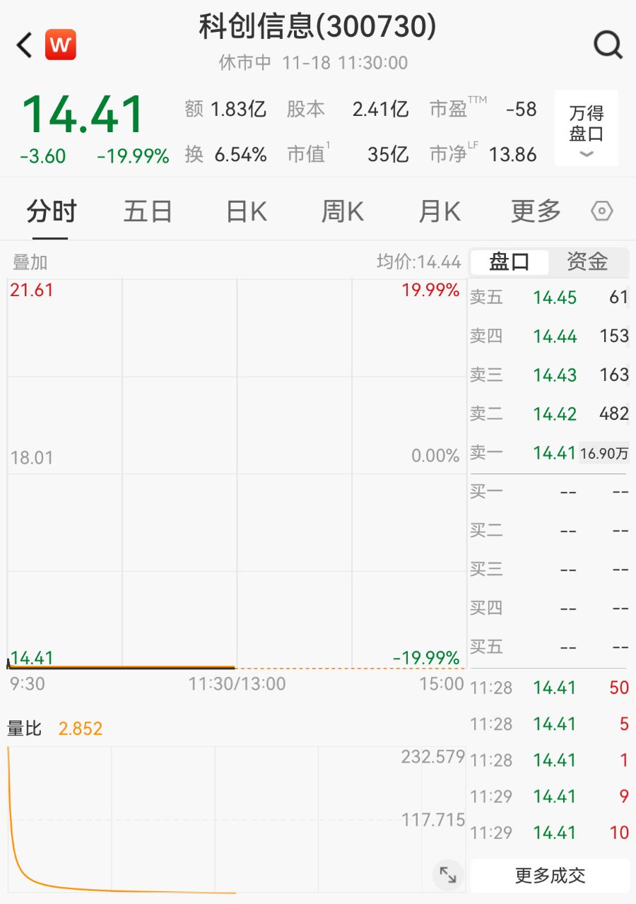 11月18日,科创信息20cm跌停,报14.41元/股,总市值为34.75亿元。截至午间收盘,卖一位置仍有近17万手卖单在排队。