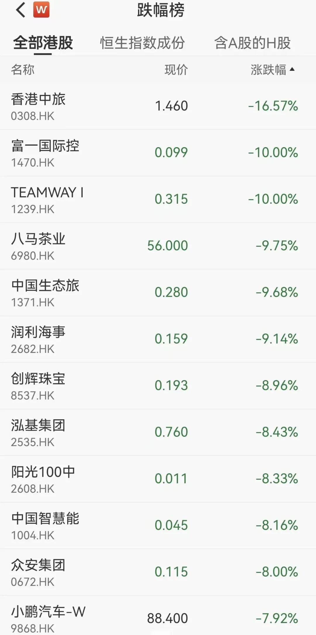 港股三大指数低开,恒生科技指数跌约1.3%。大型科技股继续低迷行情,文旅部提醒中国游客近期避免前往日本旅游,旅游股继续下跌,香港中旅大跌超16%。众安集团跌超8%,其曾持股的百保君日前被曝无法兑付(知名平台人去楼空,涉案金额或超亿元,CEO被带走)。此外,小鹏汽车跌超8%,蔚来跌3%,理想汽车跌超2%。百度、快手、腾讯等跌超1%。