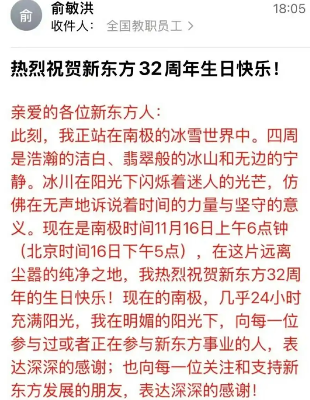 11月16日,新东方迎来成立32周年纪念日,创始人俞敏洪身处南极发布内部信,向全体员工及支持者致谢。该文开篇即细致描绘“浩瀚的洁白、翡翠般的冰山”等南极景观,称当地“几乎24小时充满阳光”的环境让他对“时间的力量与坚守的意义”有了更深感悟。