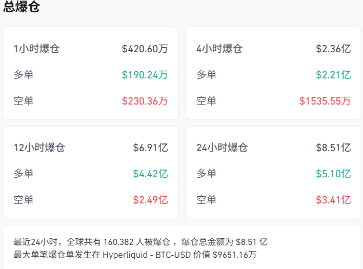 加密货币持续大跌,比特币一度跌破92000美元,以太坊跌也曾跌破3000美元。截至11月18日6:34,过去24小时内,市场超16万人被爆仓,爆仓金额8.51亿美元。