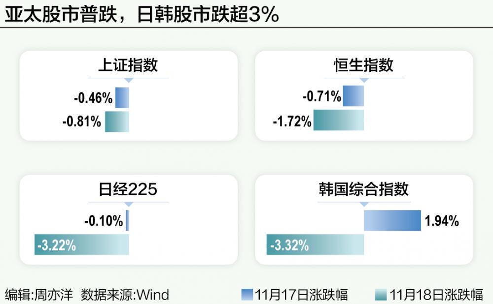 11月18日,受隔夜纽约股市三大股指全面下跌及投资者担忧日本经济前景等因素影响,亚太股市大幅震荡,日经225指数收跌3.22%,创自4月以来最大单日跌幅;韩国综合指数收跌3.32%。
