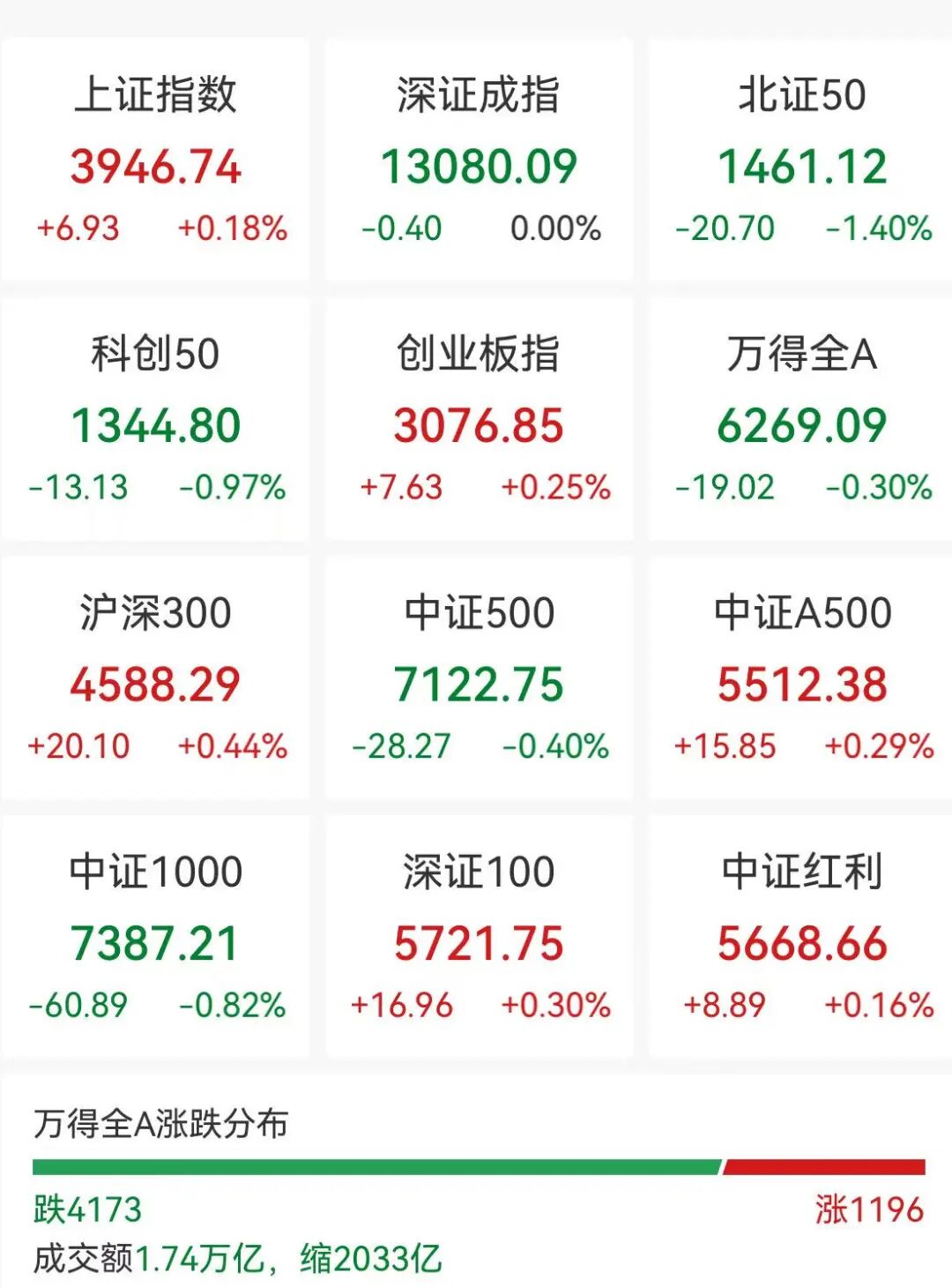 11月19日,A股三大指数冲高回落。截至收盘,沪指涨0.18%,创业板指涨0.25%。市场总成交额1.74万亿,全市场超4100只个股下跌。
