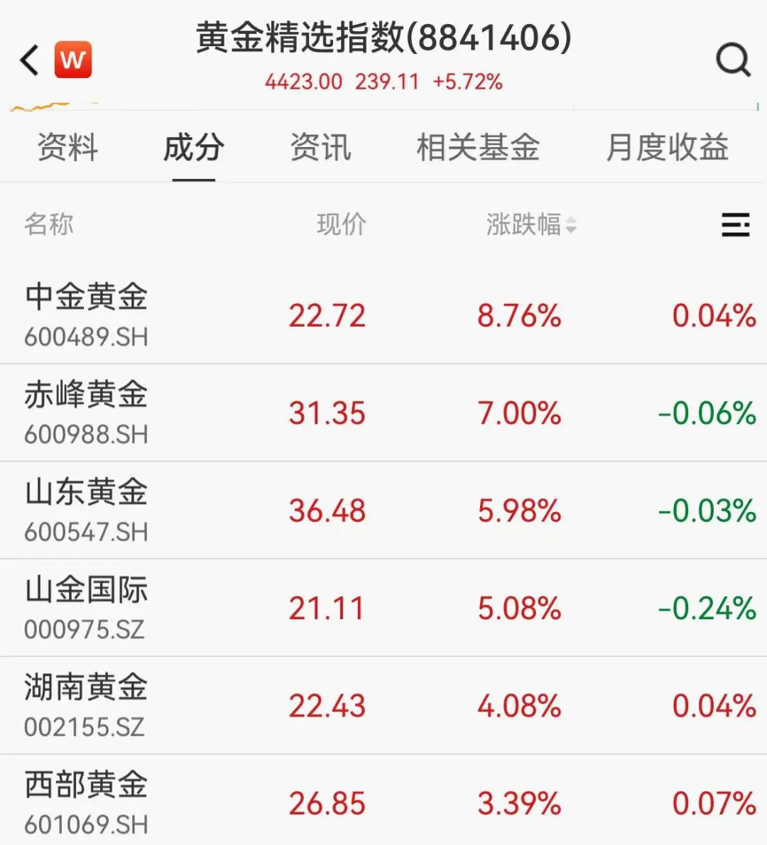 黄金股午后走强,中金黄金一度触及涨停,收涨8.76%,赤峰黄金、山东黄金、山金国际等涨幅居前。