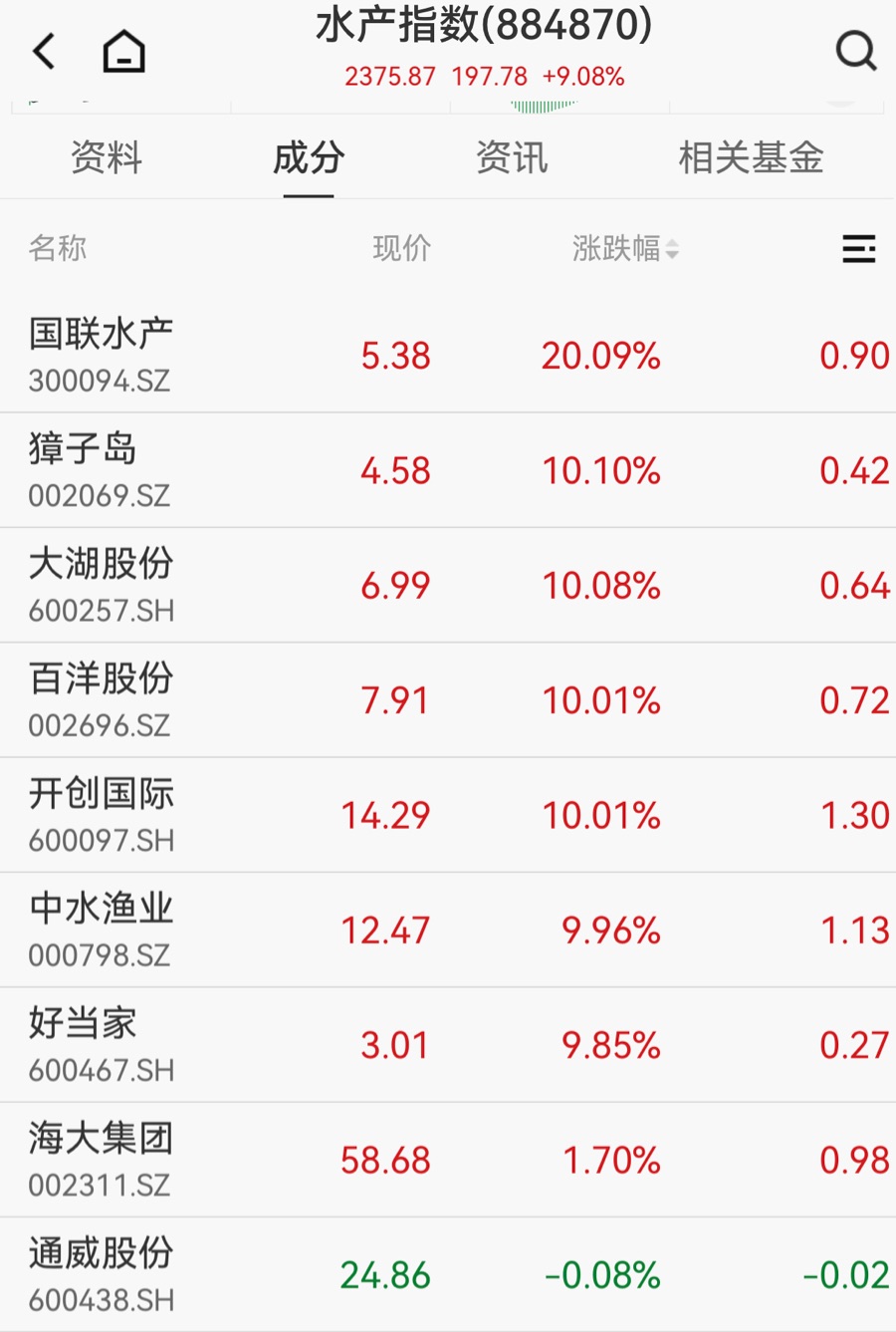 11月19日A 股午后交易时段,水产板块迎来全面爆发,多只核心个股集体拉升并封死涨停,成为当日资本市场中最受瞩目的板块之一。国联水产(300094.SZ)午后开盘即封死20%涨停板,獐子岛(002069.SZ)、大湖股份(600257.SH)、中水渔业(000798.SZ)、开创国际(600097.SH)等多只水产股亦同步涨停。截至14时14分,Wind水产指数(884870)涨幅达9.08%。