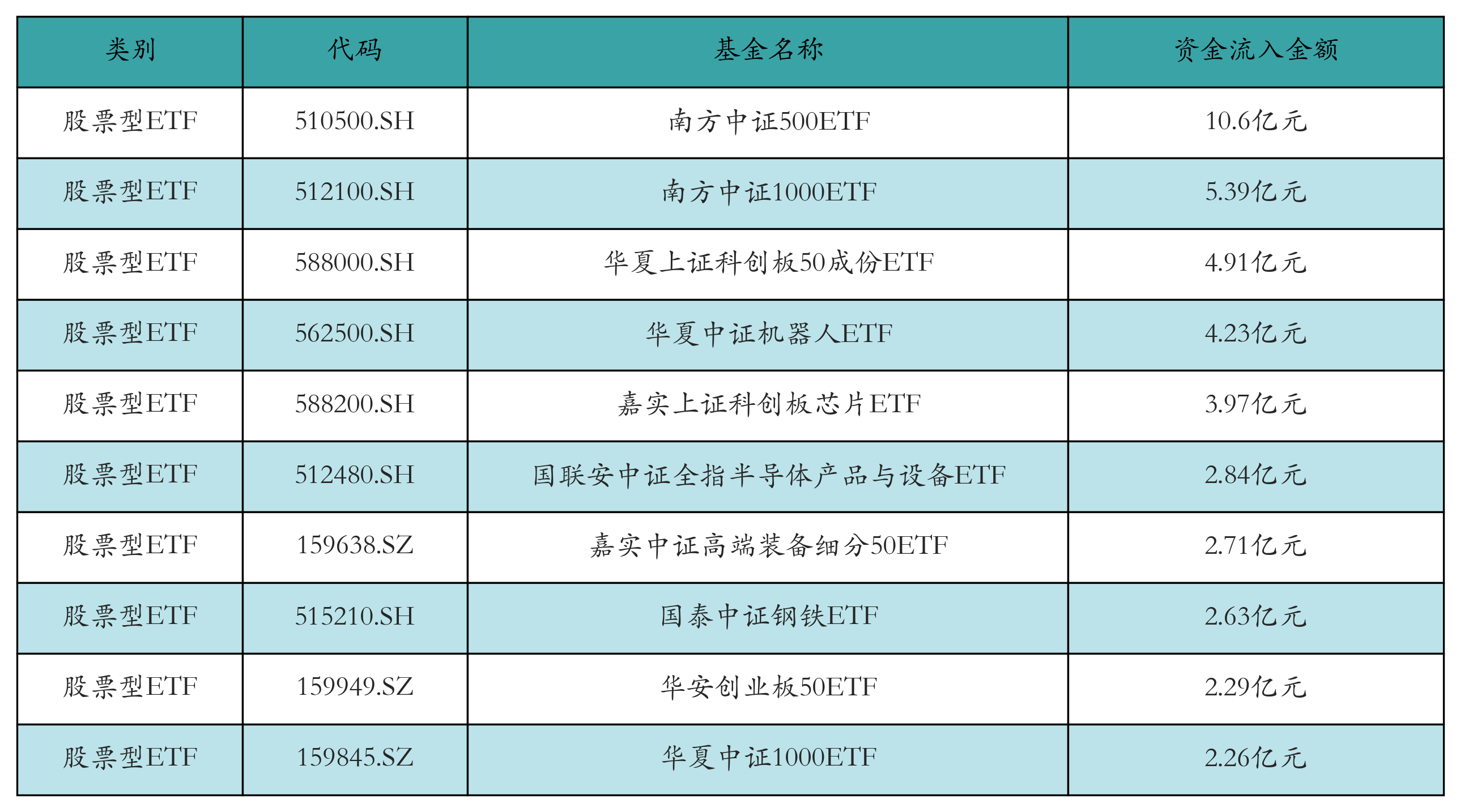 昨日股票型ETF资金流入最多的3只ETF及其流入金额分别为:南方中证500ETF(流入10.6亿元)、南方中证1000ETF(流入5.39亿元)、华夏上证科创板50成份ETF(流入4.91亿元)。资金流入前10详情见下表: